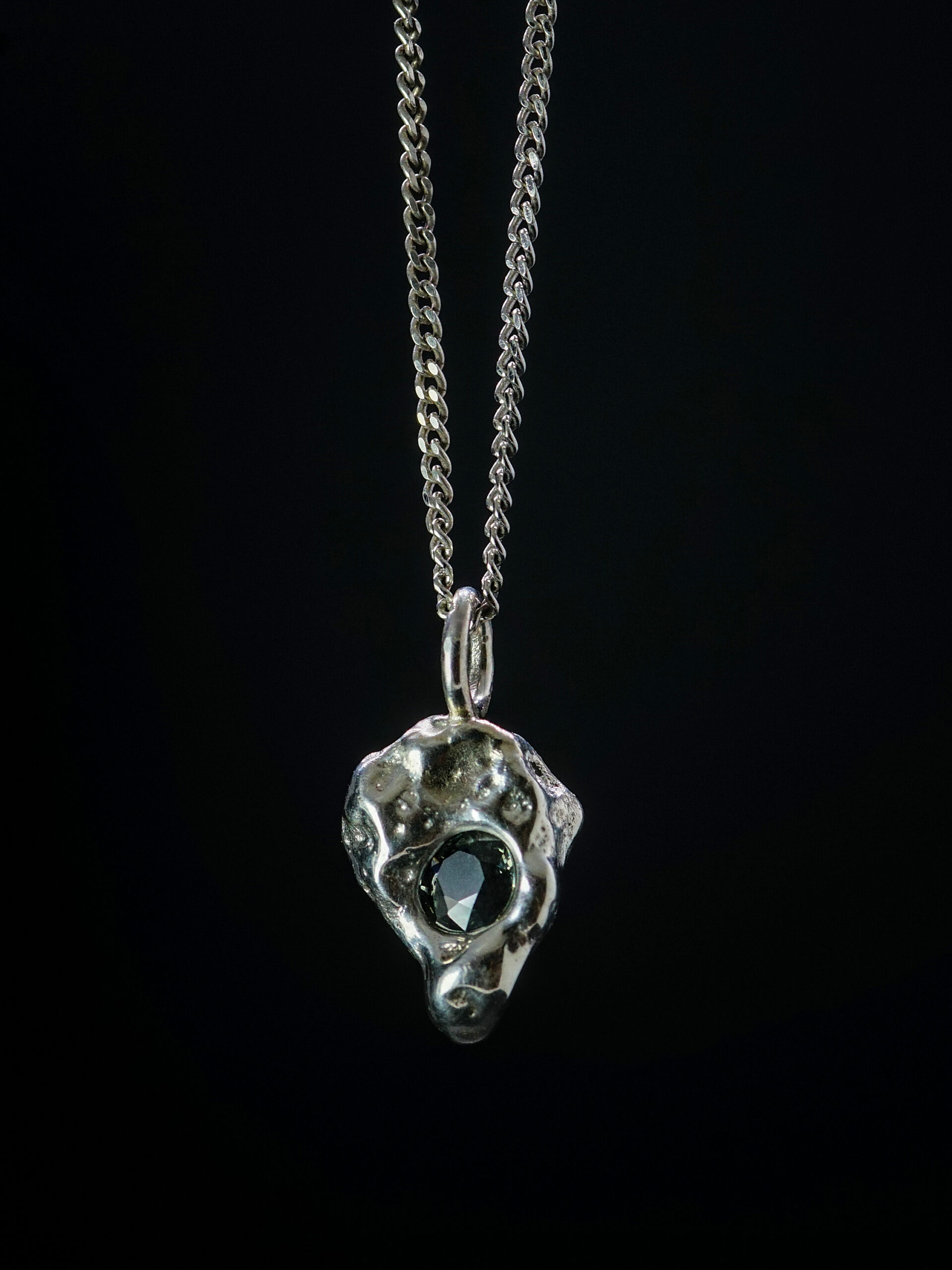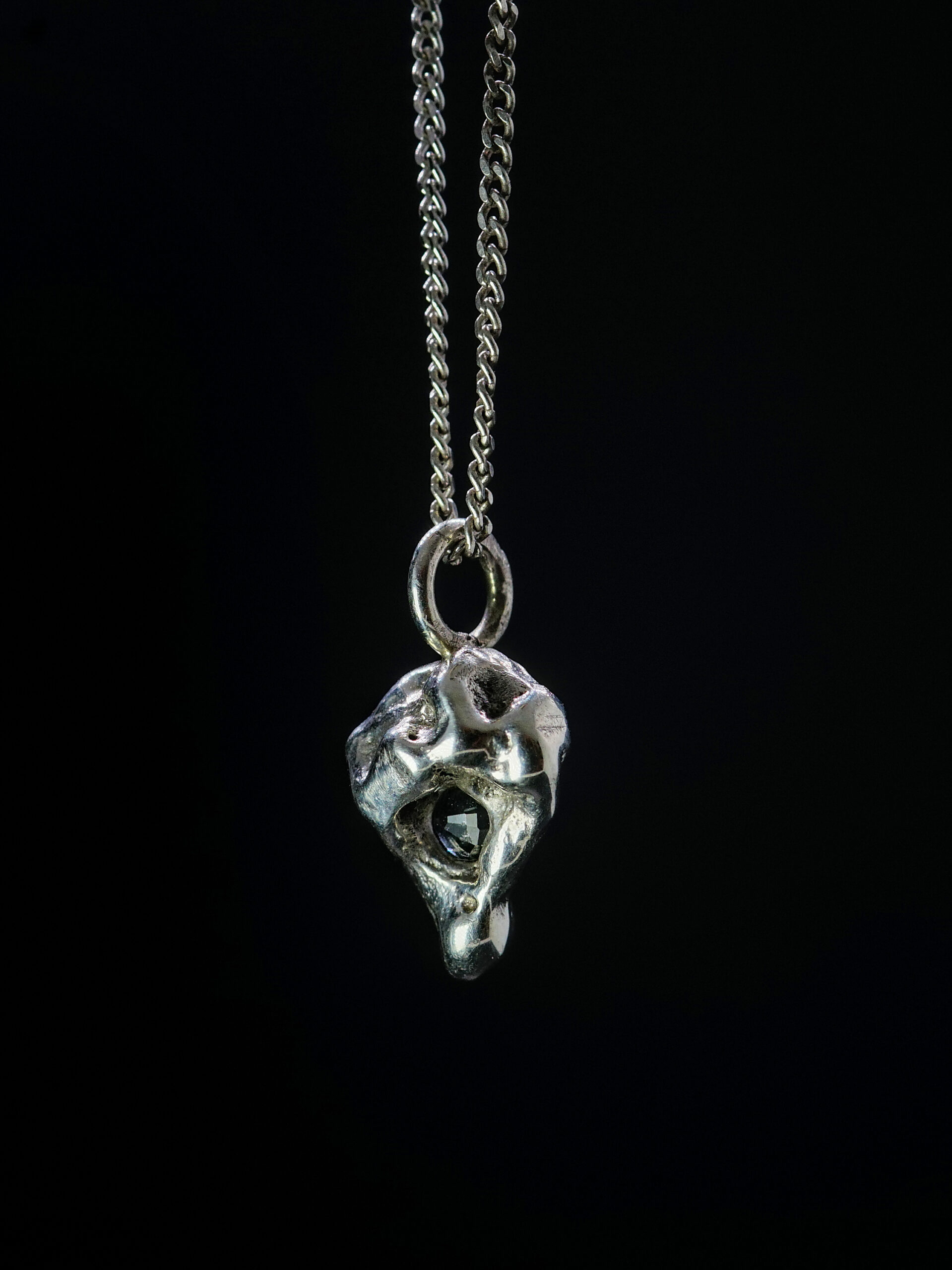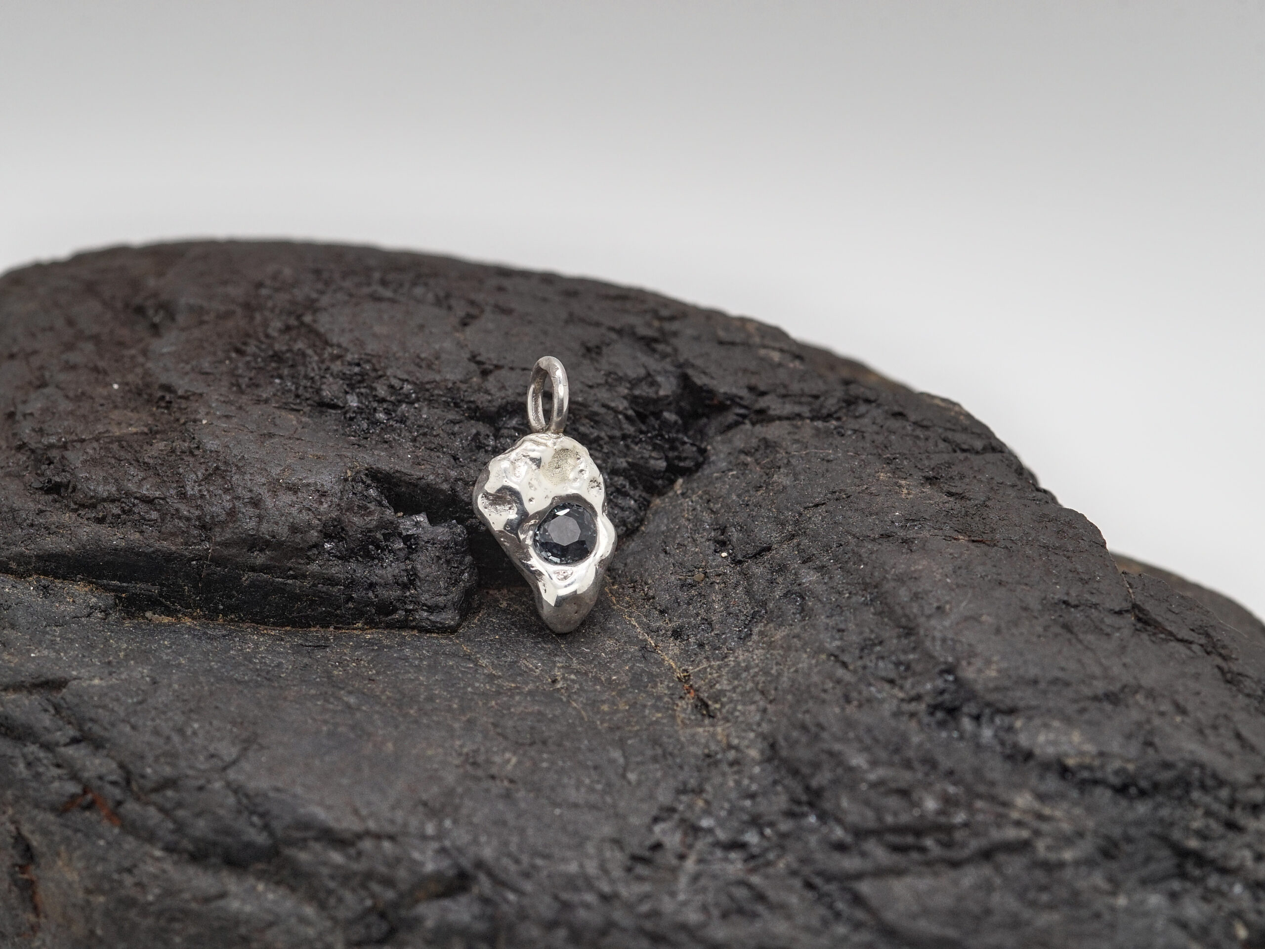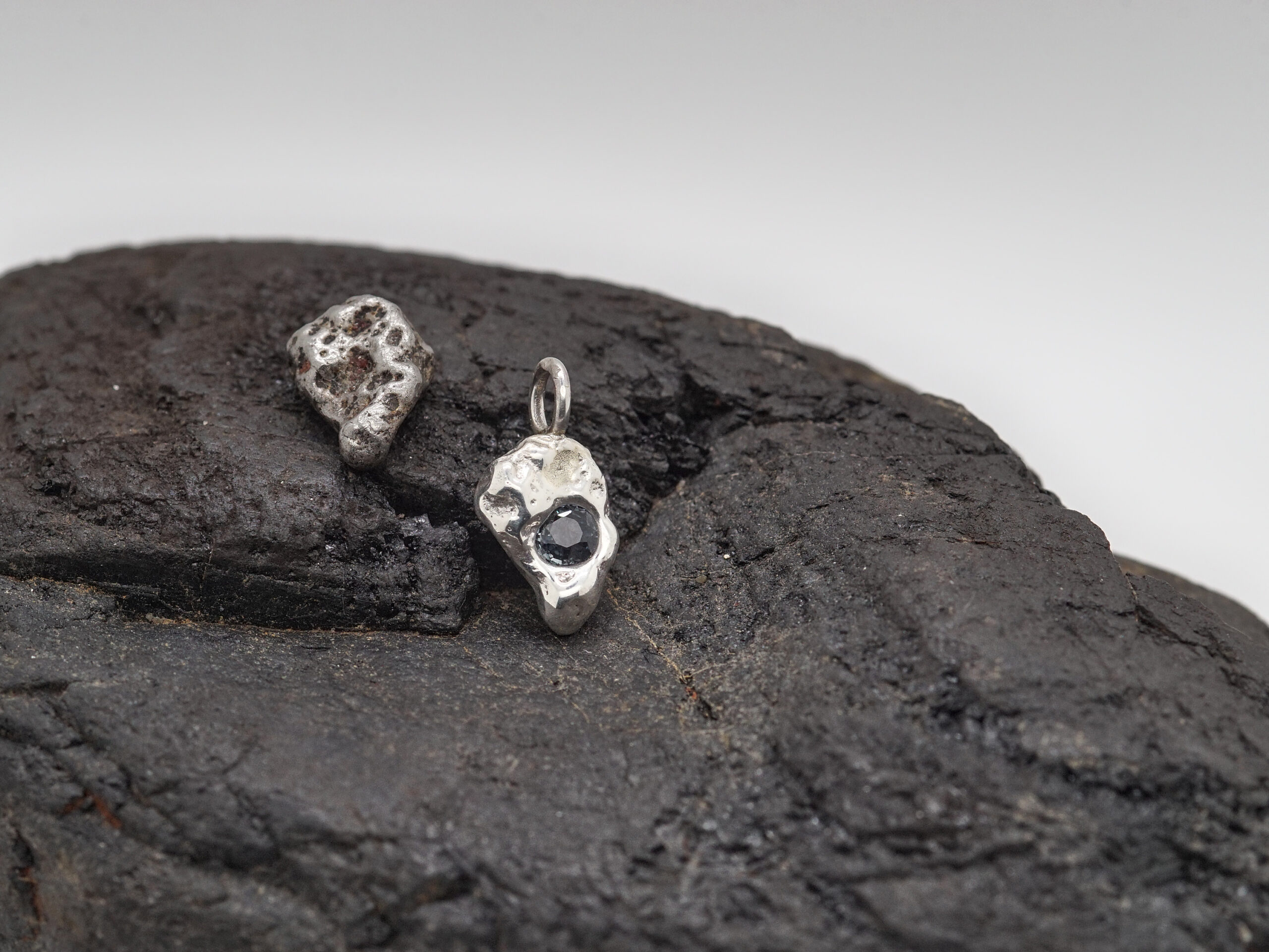 Inspiriert von Schlacke industrieller Herkunft. Jeder Anhänger ist limitiert auf 20 Stück, handwerklich gefertigt, mit oder ohne Edelstein erhältlich. Lieferung ohne Kette.